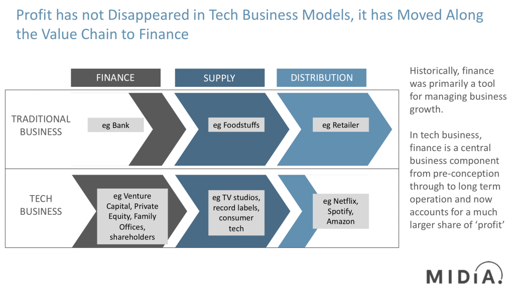 The Spotify example illustrates how profit has shifted across the value chain in tech businesses, delivering profit for investors, suppliers and founders. In effect a new ecosystem has evolved in which the new profit centres can support the distribution part of value chain indefinitely. With growth valued over profitability by shareholders, the markets provide further sustenance to the ecosystem.